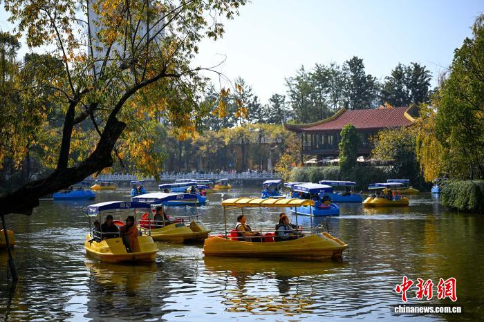 12月7日是年夜雪骨气,冬季的“秋乡”昆亮阳黑暗媚,气呼呼暖恼人,浩繁市平易近战旅客去到翠湖花园玩耍,密切当然。图为游人正在翠湖荡舟。中新社记者 刘冉阳 摄